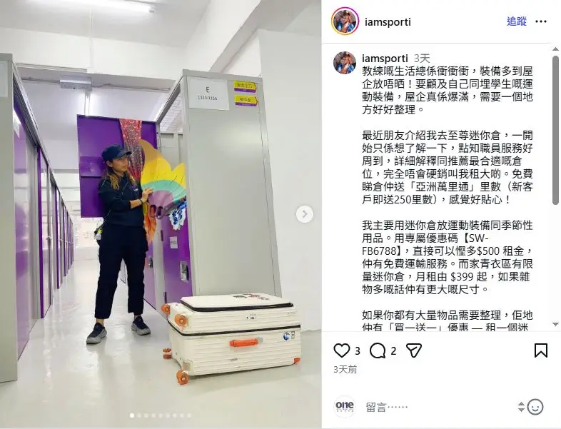 我主要用迷你倉放運動裝備同季節性用品。用專屬優惠碼【SW-FB6788】,直接可以慳多$500 租金,仲有免費運輸服務。而家青衣區有限量迷你倉,月租由 $399 起,如果雜物多嘅話仲有更大嘅尺寸。